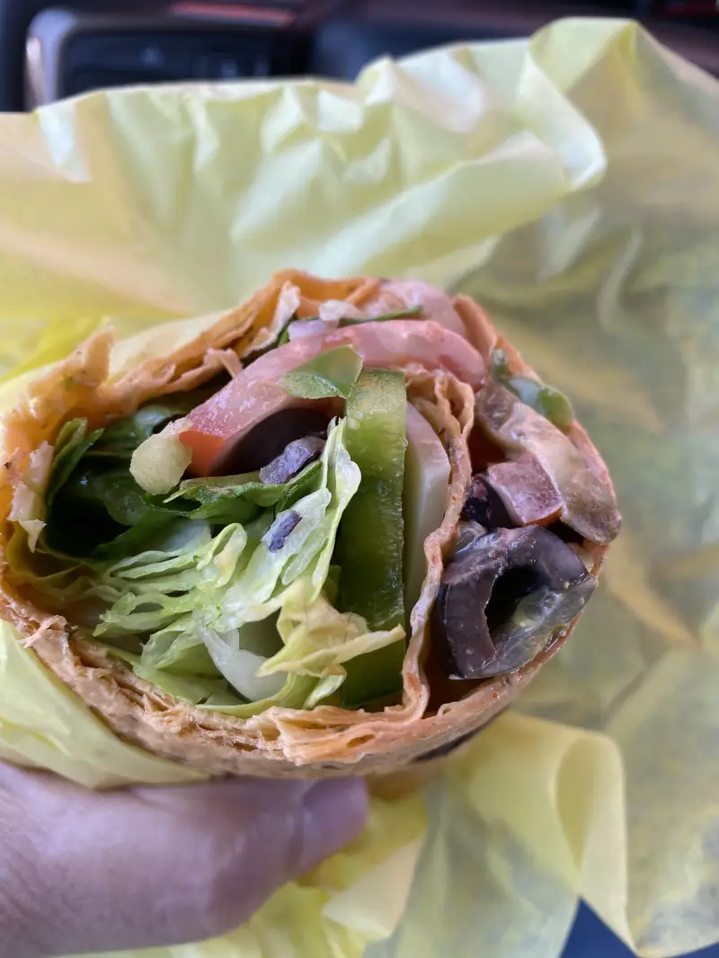 Even after driving through several swarms of grasshoppers, we still had an appetite for a healthy veggie wrap!